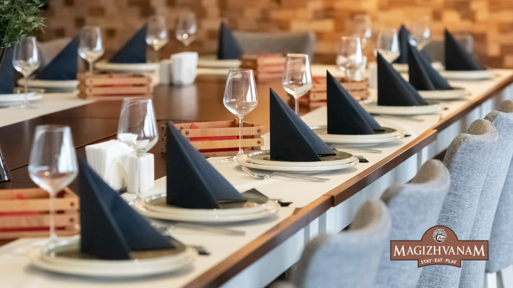 Food plays an essential role in corporate events. Magizhvanam’s in-house restaurant offers meal packages tailored for groups, ensuring teams stay energised throughout the day. From coffee breaks to full-course dinners, the dining experience supports both work and relaxation.